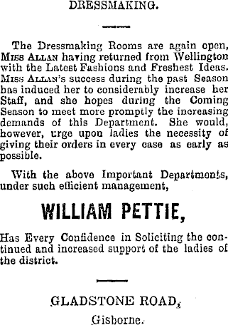DRESSMAKING. The Dressmaking Rooms are again open, Miss Allan haring returned from Wellington with the Latest Fashions and Freshest Ideas. Miss Allan's success during the past Season has induced her to considerably increase her Staff, and she hopes during the Coming Season to meet more promptly the increasing demands of this Department. She would, however, urge upon ladies the necessity of giving their orders in every case as early as possible. With the above Important Departments, under such efficient management, WILLIAM PETTIE, Has Every Confidence in Soliciting tho continued and increased support of the ladies of the district. .GLADSTONE ROAD, Gisborne.