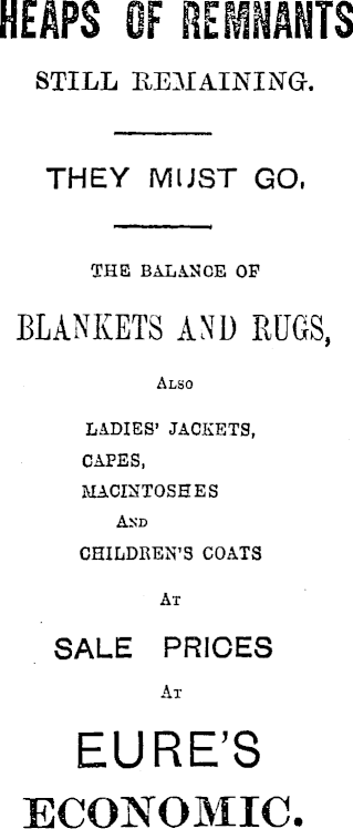 HEAPS OF REMNANTS STILL REMAINING. THEY MUST GO, THE BALANCE OF BLANKETS AND RUGS, Also LADIES’ JACKETS, CAPES, MACINTOSHES And CHILDREN’S COATS At SALE PRICES At EURE’S ECONOMIC.