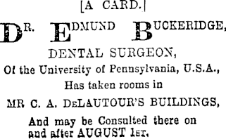 [A CARD. | jy*. •piDMUSD JgUCKERIDGE, DENTAL SURGEON, Of the University of Pennsylvania, U.S.A., Has taken rooms in MR C. A. DeLAUTOUR’S BUILDINGS, And may be Consulted there on find alter AUGUST lex.