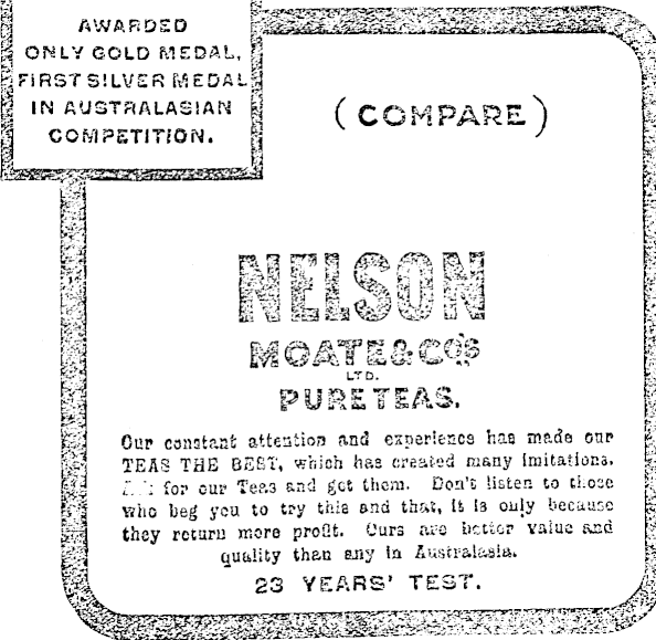 AWARDED ONLY GOLD MEDAL, i FiRST SILVER MEDAL IN AUSTRALASIAN COMPETITION. ' i£ ; sLaa&f&: ( COMPARER tti If I is H &'a s &a MOATS&CQ? U&ETEAS. Oup constant attention and experience has made on? TEAS THE BEET, which has created many imitatioca, ; '; for cur Teas and get them. Don't listen to those Who beg you to try this and that, it is only because they return more pro Qt. Ours are quality than any in Australasia. 23 YEARS’ TEST. bettor value and ™s 'w
