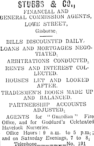 STUBBS a GO,, FINANCIAL AND GENERAL COMMISSION AGENTS, LOWE STREET, Gisborne. BILLS DISCOUNTED DAILY, LOANS AND MORTGAGES NEGOTIATED. ARBITRATIONS CONDUCTED, RENTS AND INTEREST COLLECTED. HOUSES LET AND LOOKED AFTER. TRADESMEN’S BOOKS MADE UP AND BALANCED. P A RTNERSIIIP ACCO UN T S ADJUSTED, AGENTS for “ Guardian ” Fire Office, and for Goddard’s Celebrated Havelock Nurseries. Office Hours : 9 a.m. to 5 p.m,; and on Saturday Evenings, 7 to 8, Telephone———— —No. 191