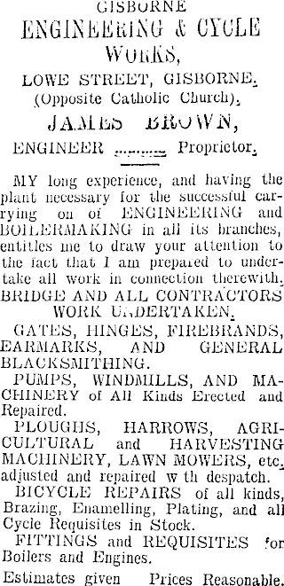 GISBORNE ENGIJsGEtU-NG A GIGLG vvui.is, LOWE STREET, GISBORNE. (Opposite Catliolic Church); JAM lib AiWVViN, ENGINEER Proprietor. MY long experience, and having the plant necessary lor the successful carrying on of ENGINEERING and BOJLEEAIAKING in all Us branches, entitles me to draw your attention to tlie fact that I am prepared to undertake all work in connection therewith. BRIDGE AND ALL CONTRACTORS" WORK UNDERTAKEN. GATES, HINGES, FIREBRANDS, EARMARKS, rtND GENERAL BLACKSMITHING. PUMPS, WINDMILLS, AND MACHINERY of All Kinds Elected and Repaired. PLOUGHS, HARROWS, AGRICULTURAL and HARVESTING MACHINERY, LAWN MOWERS, etc. adjusted and repaired w th despatch. BICYCLE REPAIRS of all kinds, Brazing, Enamelling, Plating, and all Cycle Requisites in Stock. FITTINGS and REQUISITES 'or Boilers and Engines. Estimates given Prices Reasonable.