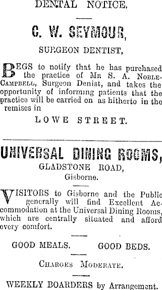 DEN,TAJ, NOTICE. C. W. SEYMOUS, SURGEON DENTIST, BEGS to notify that he has purchased the practice of Mu S. A. NobleOampbell, Surgeon Denist, and takes the opportunity of informing patients that the practice will be carried on as hitherto in the remises in LOWE STREET. UNIVERSAL DINING ROOMS. GLADSTONE ROAD, Gisborne. VISITORS to Gisborne and the Public generally will find Excellent Accommodation at the Universal Dining Rooms, which are centrally situated and afford every comfort. GOOD MEALS. GOOD BEDS. Charges Moderate. WEEKLY BOARDERS by Arrangement.
