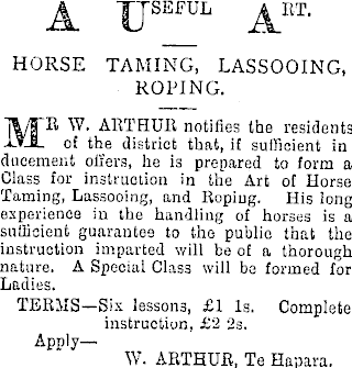'SEFUL A AnTHORSE TAMING, LASSOOING, ROPING. MR W. ARTHUR notifies the residents of the district that, if sufficient in dueement oilers, he is prepared to form a Class for instruction in the Art of Horse Taming, Lassooing, and Roping. His long experience in the handling of horses is a sufficient guarantee to the public that the instruction imparted will be of a thorough nature. A Special Class will be formed for Ladies. TERMS—Six lessons, £1 Is. Complete instruction, £2 2s. Apply— W. ARTHUR, Te Hapara.