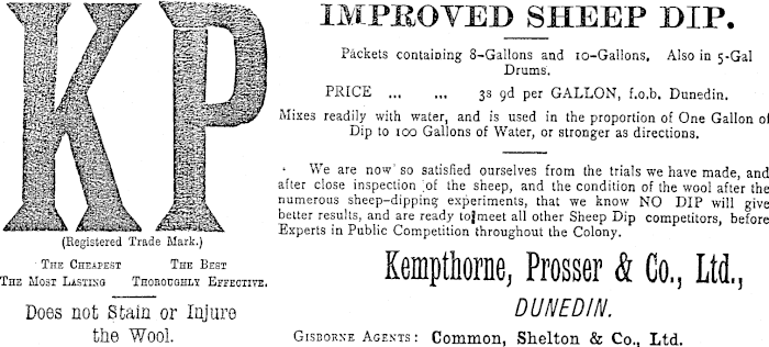 Does not Stain or Injure the Wool. IMPROVED SHEEP DIP. Packets containing 8-Gallons and io-Gallons, Drums. Also in 5-Gal PRICE ... ... 3s 9d per GALLON, f.o.b. Dunedin. Mixes readily with water, and is used in the proportion of One Gallon of Dip to 100 Gallons of Water, or stronger as directions. (Registered Trade Mark. Tiie Cheapest The Best The Most Lastixo Thoroughly Effective. ■ We are now' so satisfied ourselves from the trials we have made, and after close inspection of the sheep, and the condition of the wool after the numerous sheep-dipping experiments, that we know NO DIP will give better results, and are ready tojmeet all other Sheep Dip competitors, before Experts in Public Competition throughout the Colony. Kempthorne, Prosser & Co., Ltd, DUNEDIN. Gisborne Agents : Common, Shelton & Co., Ltd.