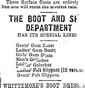 These Surface Coats are entirely line acu will resist the severest rain. THE BOOT AMD Si DEPARTMENT HAS ITS SPECIAL LINE! Gents' Gum Eoots Ladies’ Gum Boots Girls’ Gum Bo o tg Men’s Gn'.oshes Lad’' d3 ’ Goloshes ladles’ Felt SlippfeM (12 Vftl'hll. Gents’ Felt Slippers. WHITTEMOKE’S BOOT DEESb.h