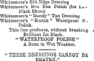Whittemore’s Gilt Edge Dressing Whittemore's Ben Ton Polish (for Da i Black Shoes) Whittemore’s “ Dandy ” Tan Dressing Whittemore’s " Boston " Waterprool B . Polish. This line produces, without brushing. Brilliant Jet Black. •‘WATERPROOF POLISH ” A Boon in Wet Weather. "THESE DRESSINGS CANNOT BE BEATEN."
