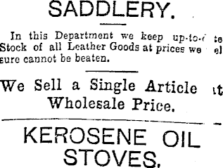 SADDLERY. In this Department we keep up-to-r te Stock of all Leather Goods at prices we eJ sure cannot be beaten. We Sell a Single Article it Wholesale Price. KEROSENE OIL STOVES.
