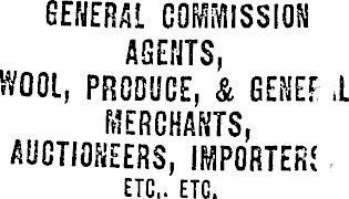 GENERAL COMMISSION AGENTS, WOOL, PRODUCE, & GENEF ,L MERCHANTS, AUCTIONEERS, IMPORTER! ETC,. ETC.