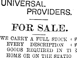 UNIVERSAL PROVIDERS. for_sale. WE CARRY A FULL STOCK ( F EVERY DESCRIPTION ( F GOODS REQUIRED IN T 1 3 HOME OR ON THE STATIO