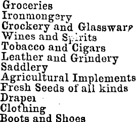 | Groceries Ironmongery Crockery and Glassware Wines and Spirits Tobacco and Cigars Leather and Grindery Saddlery Agricultural Implements Fresh Seeds of all kinds Drapei Clothing Boots and Shoes