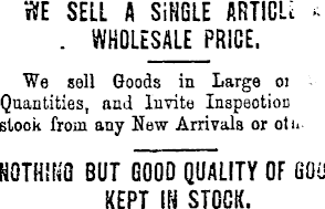 WE SELL A SINGLE ARTICLc ■ . WHOLESALE PRICE. We sell Goods in Large oi Quantities, and Invite Inspection stock from any New Arrivals or ot i. NOTHING BUT GOOD QUALITY OF GO KEPT IN STOCK.