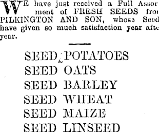 WE have just received a Full Assor ment of FllfiSU SEEDS fro. PILKINGTON AND SON, whose Seed have given bo muoh satisfaction year afti year. SEE Lr POTATOES SEED OATS SEED BAItLEY SEED WHEAT SEED MAIZE SEED LINSEED