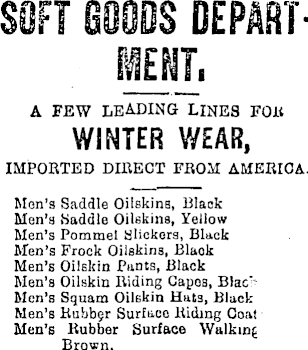 A FEW LEADING LINES FOR WINTER WEAR, IMPORTED DIRECT FROM AMERICA. Men’s Saddle Oilskins, Black Men’s Saddle Oilskins, Yellow Men’s Pommel Slickers, Black Men’s Frock Oilskins, Blaok Men’s Oilskin Pants, Black Men’s Oilskin Riding Capes, Blac' Men's Scjuam Oilskin Hats, Black Men’s Kubbpr Surface Riding Coat Men’s Rubber Surface Walking Brown.