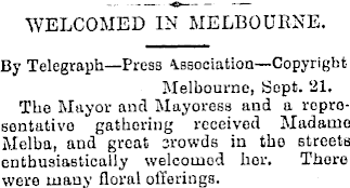 WELCOMED IN MELBOURNE. By Telegraph—Press Association—Copyright Melbourne, Sept. 21. The Mayor and Mayoress and a representative gathering received Madamo Melba, and great crowds in tho streets enthusiastically welcomod her. Thore were many floral offerings.