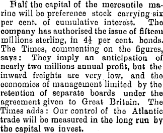 Palf tho capital of the mercantile marine will bo preference stock carrying six per cent, of cumulative interest. The company has authorised the issue of fifteen millions sterling, in 41 per cent, bonds. Tho Times, commenting on tho figures, says: They imply an anticipation of nearly two millions annual profit, but the inward freights are very low, and tho economies of management limited by tho retention of separate boards under the agreement given to Great Britain. The Times adds : Our control of tho Atlantic trade will bo measured in tho long run by tho capital wo invest.
