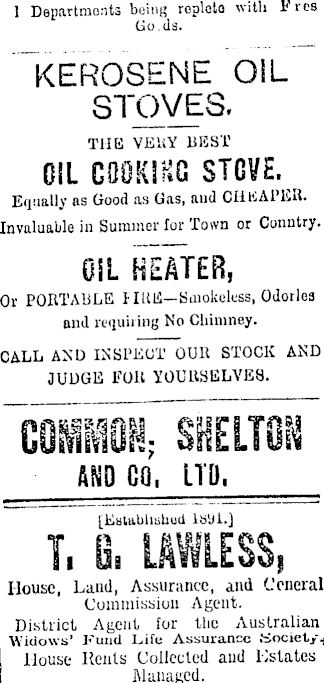 1 Departments being repleto with Free Gods. KEROSENE OSL STOVES. THE VERY BEST OIL COOKIKG STOVE. Equally ns Good ns Gas, and CHEAPER. Invaluable in Summer for Town or Country. OSL HEATER, Or PORTABLE HUE—Smokeless, Odorles and requiring No Chimney. CALL AND INSPECT OUR STOCK AND JUDGE FOR YOURSELVES. COM ; SHELTOH fiSD co, ini, [Eatabluihud lb'Jl.] T, g, LAWLESS, House, Land, Assurance, and Crneral Commission Agent. District Agent for the Australian Widows’ Fund Lite Assurance .Society.. House Kents Collected and Estates Managed.