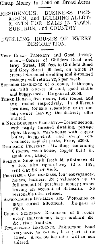 Cheap Money to Lend on Broad Acres RESIDENCES, BUSINESS PREMISES, and BUILDING ALLOTMENTS FOR SALE IN TOWN,. SUBURBS, and COUN TRY. DWELLING HOUSES OF EVERY DESCRIPTION. Very Cheap Property and Good Investment.— Corner o£ Childers Road and Grey Street, 1(15 leet to Childers Road and Grey Street CO feet, on which i 3 erected (broomed dwelling and d-roomed cottage ; will return 22/0 per week. Superior Residence of H rooms, bathroom, etc., with daces ol land, good stable and buggy-shed. Bargain at £05(1. Three Houses, live rooms, lour rooms, and two rooms respectively, in dillereul localities, lor sale separately or m one lot; owner leaving the district; oiler wanted. A Nice ben urban' Property.—Corner section, with nojjlly finished dwelling, passageright through, warti-house with cupper boiler, buggy-shed, and every eonveuiecce, uspiiait paths, Priee, £-ibh. Desirable Pruperiv —Dwelling cumuimng (3 rooms, wash-house, copper bunt in, stable Ac., band). Splenlik buop with freeli Id Allotment 44. i 105, also right-of-way 12 i 100: rent dat £3 p r we.k. Profitable Cab business, four conveyances, hoises harness, Ac.; valuation up to full amount <1 purchase money ; owner leaving ell account of ill healtu. Ro reasonable oiler refused. Seven-rooaieu Dwelling and Workshop on large corner allotment. Ra ga n at i'oUO. Choice bUBURBAN Eksiden'cr of y looms, every couvenitnc , larg-i orchard Ac . Ac , rivir frontage. Pivii-ROOMEO Resioenck, Palmersmn Hoad, von close tu School, best part cf ib street. A ic-u onuti.c oiler will oe con bidfeied,