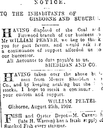 is 0 X I C K . TO THE INHABITANTS OF GiSBOKNE AND SUBETBE HAVING disposed of the Coal FI d Firewood branch of cur business o Mr WILLIAM PE BY LB, we beg to tba- k. you for past favors, and v.cuid ask i.r I a continuance of support afforded us o our fcucces=or. Ali Account-? to dat* payable to us. SHEiUDAN AND CG. RAVING taken over the above br : - nets from Messrs Sheridan r : Co., and by keeping nothing but rhe stocks, I hope to merit a continuer . '• vour custom and support. WILLIAM PF.LYEI, Gisborne, August 23th, 1002. FISH and Oyster Depot-M. Cavan; h (rate H. Warren) has a frcEh supply ui Smoked Fish every stc-amer.