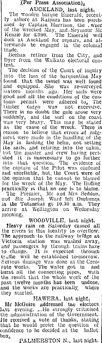 j(Per Press Association)*AUCKLAND, last night.; The wooden barque Emerald, recently ashore at Kaipara has been purchased by Captain Harrison, the . wner of the wrecked May, and /Seymour Blc Kenzie for £9OO. The Emerald will dock at Auckland for repairs, and afterwards he engaged in the colonial trade. Beehan retires from the City, and Dyer from the Waikato electoral contest. The decision of the Court of inquiry into the loss of the barquentine May found that the vessel was well found and equipped. She was re-surveyed sixteen months ago. Her sails were good and ail the conditions of the customs permit were adhered to* The timber cargo was not excessive. There is no doubt the gale arose very suddenly, and the surf on the coast was very heavy. This may he stated as the cause of the wreck. There is reason to believe that errors .of judgment were made in the handling, of the May in lashing the helm, not setting the sails, and retiring into the cabin, but tho master and crew having perished it is unnecessary to go further into that question,. The evidence of the captain of the Pilot was confused and unreliable, but. (he Court were of the opinion that he cannot be blamed for the wreck of tho May. The finding practically is that no one is to blame. The Premier, Mr and Mrs Seddon, and Sir Joseph Ward left Onehunga in the Tutanekai gt 1U.30 a.m. They arrive at Wellington on Wednesday morning, WOODVILLE, last night. Heavy rain on Saturday caused all the rivers 'in this locality to overflow. The approach ■ to the railway bridge at Victoria station was washed away, and passengers by through trains have to change. It is expected through traffic will be established to-morrow. Serious damage was done at the Creosote works. Tlie water got in and burst all the connecting pipes, with the result that the whole work of the past twelve months has been undone, and the works are practically, where they started. I-lAWERA, last night; Mr McGuire addressed the electors last evening. ...He strongly criticised the administration of the Government. He received a vote of thanks, stating that he would prefer the question of confidence to bo decided at the ballot box. PALMERSTON N., last night.