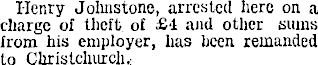 Henry Johnstone, arrested here on a charge of theft of £4 and other sums from his employer, lias been remanded to Christchurch.
