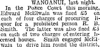 WANGANUI, last night. In the Police Court this morning, Edward McElwain was fined £5 on each of four charges of procuring liquor for a prohibited person R. B. Smith. The latter was also fined £5 on each of two charges of entering licensed houses. Smith engaged McElwain to drive him round the district,