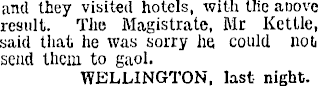 and they visited hotels, with tlie atiovc result. The Magistrate, Mr Kettle, said that he was sorry lie could not send them to gaol. WELLINGTON, last- night.