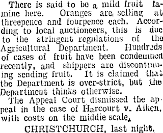 There is said to be a mild fruit famine here. Oranges are, selling at threepence and fourpence each. According to local auctioneers, this is due to tlie stringent regulations of the Agricultural Department. Hundreds of cases of fruit have been condemned recently, and shippers arc discontinuing sending fruit. It is claimed that tlie Department is over-strict, but the Department thinks otherwise. The Appeal Court, dismissed the appeal in the case of Harcourt v, Aiken, with costs on the middie scale* CHRISTCHURCH, last night,