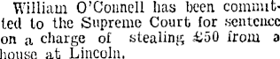 William O’Connell has been committed to the Supreme Court for sentence on a charge of stealing £SO from a house at Lincoln.