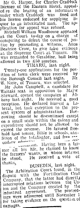 Mr Cf. Harper, for Charles Craddock licensee of the Eastern Hotel, appealed re the hearing of an informacim under which Craddock was fined and his license endorsed for supplying liquor to an intoxicated man. The application for appeal was refused. Mitchell William Woodhouse appeared at, the Court to-day on a charge of conspiring to defeat the course of justice by persuading a witness, Alice Beatrice Crow, to give false evidence at the Supreme Court at Timar.u. He was remanded to Geraldine, hail being allowed in two £SO sureties. TIMARU, last night. Twenty-one applications for the position of town clerk were received by the Borough Council last night,. Mt W. Nicie, of Timaru, was selected. Mr John Campbell, a. candidate for Waitaki seat in opposition to Major Steward, opened the campaign at Albany last night. He received a gooi reception. He declared himself a Liberal, but took exception to the present system of administration. Borrowing should be discontinued except on a small scale within the colony and expenditure should not he allowed to exceed the revenue, lie favored freehold land tenure, Bible in schools, abolition of the totalisator, and fre* omhiru w '"^ vuUll Having been a farmer" all "his life, he claimed to know the farmers’ wants, in whose invest lie stood,. He received a vote of thanks. DUNEDIN, last night. The Arbitration Court found, in the dispute with the Fortification Coal Company that the latter had directly huerrupted relations between the Union and the Company created by ,!>e industrial agreement. The proceedings were adjourned until Notemoer x for taking evidence oil the question of damages. -