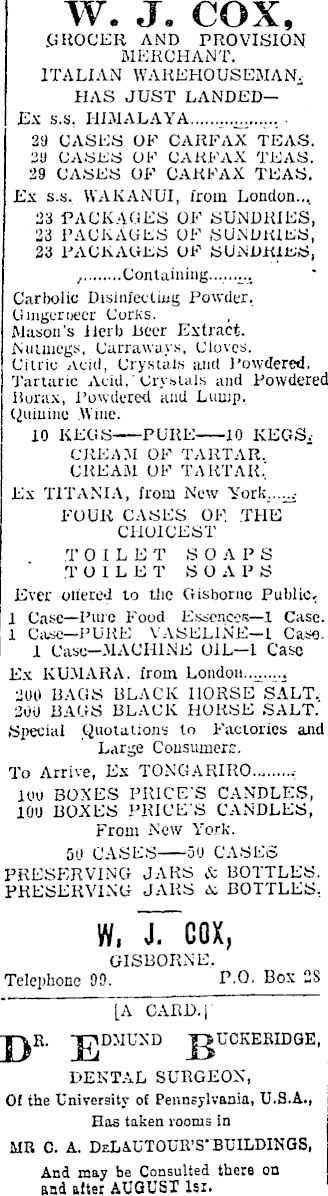 W. J. cox, GROCER AND PROVISION MERCHANT. ITALIAN WAREHOUSEMAN. HAS JUST LANDED— Ex s.s. HIMALAYA ............ 29 CASES OF CARFAX TEAS. 21) CASES OF CARFAX TEAS. 29 CASES OF CARFAX TEAS. Ex s.s. WAKANUI, from London.., 23 PACKAGES OF SUNDRIES, 23 PACKAGES OF SUNDRIES, 23 PACKAGES OF SUNDRIES, , Containing......... Carbolic Disinfecting Powder. Ginger ueer Corks. Mason's Herb Deer Extract. Nutmegs, Carraways, Cloves. Citric Acid, Crystals and Powdered. Tartaric Acid.'Crystals and Powdered Borax, Powdered and Lump. Quinine Wine. 10 KEGS PURE 10 KEGS, CREAM OF TARTAR. CREAM OF TARTAR, Ex TH’ANIA, from New FOUR CASES OF. THE CHOICEST TOILET SO APS TOIL E T SOAPS Ever onered to tlie Gisborne Public, I Case—Pure Food Essences—l Case. 1 Case—PURE VASELINE—I Case. 1 Case —MACHINE OIL—I Case Ex KUMARA. from L0nd0n...^..... 200 BAGS BLACK HORSE SALT. 200 BAGS BLACK HORSE SALT. Special Quotations to Factories and I Large Consumers. j To Arrive, Ex TONGARIRO 100 BOXES PRICE'S CANDLES, 100 BOXES PRICE'S CANDLES, From New York. 50 CASES 50 CASES PRESERVING JARS & BOTTLE'S. PRESERVING JARS A BOTTLES, W, J. COX, GISBORNE. Telephone 99. I’.O. Box 2S [A CARD, i D r, E dmuxd JgUCKERIDGE, DENTAL SURGEON, Of the University of Pennsylvania, U.S.A., Has taken rooms in MR C. A. DeLAUTOUR’S' BUILDINGS, And may be Consulted there on and after AUGUST lsi.