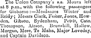 The Union Company's s.s. Mount left at 8 p.m., with the following passengers for Gisborne :—Mcsdamcs Winter and Reidy-; Messrs Clark, Fisher, Jones, Howden, Gibson, Sydenham, Pettit, Cato, Thompson, Airson, Brunskill, Hollow, Morgan, Mere, To Malta, Major Loveday, and Captain Davidson.