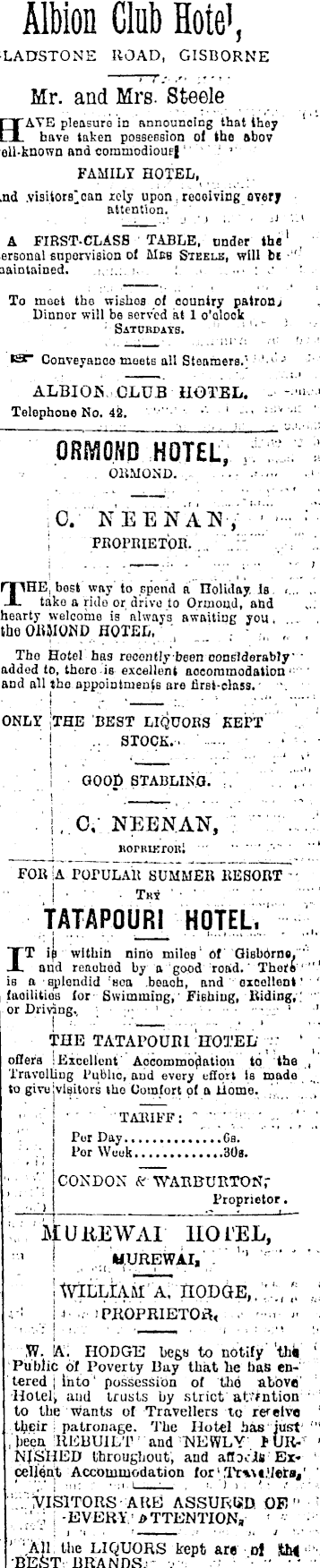 Albion Club Hole', GLADSTONE ROAD, GISBORNE Mr. and Mrs. Steele HAVE pleasure in announcing that they have taken possession of the ftbov ?ell-known and commodious! " ! >• FAMILY HOTEL, knd rely upon receiving every attention. A FIRST-CLASS TABLE, under the' 1 jersonal supervision of Msb Steels, will be naintained. To moot the wiskos of country patronj Dinnor will bo served at 1 o'alook Saturdays. Conveyance moots all Stoamera.' ALBION CLUB HOTEL, Telephone No. 42, ORMOND HOTEL, ORMOND. C. KEENAN, PROPRIETOR. THE, best way to spend a Holiday Is ttiko a ride or drive to Ormond, abd hearty welcome is always awaiting you the OMIOh’D HOTEL, Tho Hotol has roeontly been considerably 1 added to, thoro is excellent accommodation and all tho appointments are first-class. ONLY THE BEST LIQUORS KEPT j . STOCK. good stabling. . /j, C. KEEN AN, : KoruiKroit; FOR |a POPULAR SUMMER RESORT | • Thy ' HOTEL, IT ip within nin'o miles' of Gisborne, ' and rcaobod by a good road. There is a splendid soa boaoh, and oicellont' facilities for Swimming, Fishing, Riding,' or Driving,. 1 * •* THE TATAPOUBI HOTEL offers Excellent Accommodation to tha , Travelling Public, and every effort is made . to give Visitors tho Comfort of ft Home. TARIFF: ! Per Day Gb. Per Week ..30s. | CONDON fi WARBURTONf ) | Proprietor. MUEEWAI HOTEL, ! MUREWAI, ! ‘ ' ' WILLIAM A. HODGE,.J i PROPRIETOR, i i' ■ .W. A. HODGE begs to notify the Public of Poverty Hay that he has entered ; into' possession of tho above Hotel, ami trusts by strict at'fntion to the wants of Travellers to receive their patronage, 'l’he Hotel has just , been REBUILT and NEWLY FUR- ■ NJSHED throughout, and affacis Excellent Accommodation for 1 ,Tmt.’lets/ VISITORS ARE ASSURIiD OF)" ’ : -EVERY ATTENTION, .All tlie LIQUORS kept are ol thU BEST BRANDS;