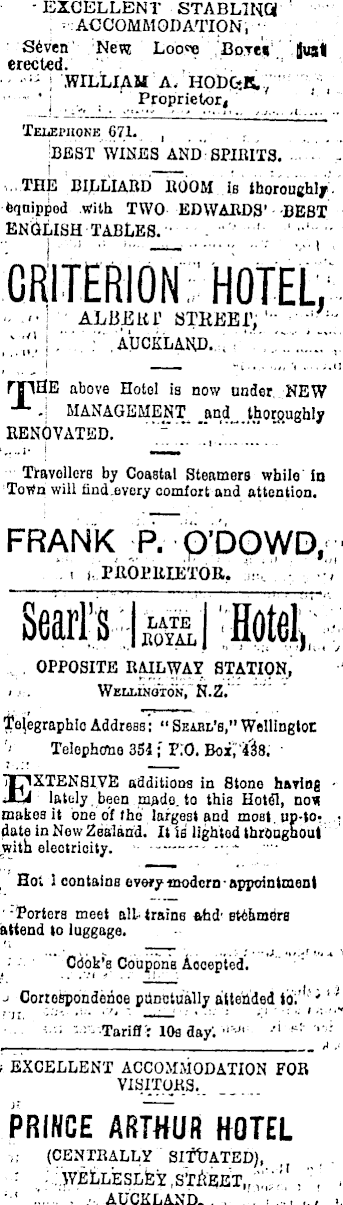 EXCELLENT STABLIKGj ACCOMMODATION, Seven New Bore* {Just erected. WILLIAM A. HODGiE., Proprietor, Teuephonk 671. , BEST WINES AND SPIRITS. THE BILLIARD ROOM is thoroughly equipped With TWO EDWARDS' BEST ENGLISH TABLES. CRITERION HOTEL. -■ ALBERT STHEEi’, ' / j ' AUCKLAND. . . mHE above Hotol is now under NEW MANAGEMENT and thoroughly RENOVATED. Travellers by Coastal Steamers while in Town will iind.ovory comfort and attention. FRANK P. O’DOWD, i . rjtOPSUKTOR. SearFs Hotel, OPPOSITE RAILWAY STATION, . i . . W ELLINGTON, N.Z. Telegraphic Address: “ Seabl’s," Wellington Telephone 354 FIO. Box,'4iSß. EXTENSIVE additions in Stono having lately been made, to this Hot(sl, now makes it one of the largest and mostup-to. ■ date in New Zealand. It la lighted throughout with electricity. Hoi 1 contains every-modern appointment Porters meet all- trains ahd etekmors attend to luggage. COok's Coupons Accepted. •> Correspondence punctually attended to.' i 1; Tariff ': 10a day! "' J ' ' ' ; EXCELLENT ACCOMMODATION FOR ' VISITORS. PRINCE ARTHUR HOTEL (CENTRALLY SITUATED), WELLESLEY .STREET,, . - AUCKLAND. . , ‘