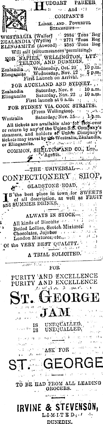 HUDDABT PAIIKER. *« And T! ■ lUBKI COMPANY’S 1 LAIIOE.. ISD , PO'YEEI'M, Steamsuips— WPS’PKAIjIA (Waller) 2884 Tons Keg V 3 '% oaa '52 KLINGAMITE (Atwood) 2580 'Tons ltog Will sail (circum3tanc'es’permitting)i SOB NaTIEiC' WELLIN’ bTON, LYT- ** ' TEUTON, AND DUNEDIN. |t j( Zoalandift,' Wednesday, Oct. 29 .. 10 p.m. ElingwuHe ' .Wednesday, Nov..!- *?P'™! First Launch on Arrival. ! . . 108 AUCKLAND AND SYDNEY. , , Zealandia Saturday, Nov. 8 10 a.m. Elingamito Saturday, Nov. 22 „10 a.m. First launch at 6 a.un ■; . FOB SYDNEY VIA, COOK ST BAITS;. (From Wellington). •> Westralia Saturday,'Nov. 15,,, , L>m. All ticketß are available also foK or return by any'of tbo Union S£. Company s steamers, and holders of; Uhitfc Company’s tickets may travel by UJeWestrahavZbalandia, or Elingamite. V" • ” f j COMMON, CO., Ltd., ,< -VAgetits. •• " * THE UNIVERSAL—-coK-rECTioirmiY shop, sf- GLADSTONE KOAD, ■yS 'the best place in town . for SWEETS JL of all description, as well as iltull ahd SUMMEB DRINKS. ALWAYS IN STOCK— I All kinds of Biscuits- ' ■ '» jjoiiod Lollies, Ecotoh MlstuWs- i - Chocolates, Jujubes London Mixtures;,etc.,, ' ■' ••> Of the VEBY BEST QUALITY. 1 A TRIAL SOLICITED. PURITY ‘AMD EXCELLENCE PURITY AND EXCELLENCE St. George JAM is UNEQUALLED. IS UNEQUALLED. ■ ASK FOE ST. GEORGE TO BE HAD FROM ALL LEADING GBOCEBS. IRVINE & STEVENSON, L-I M I T E D , ■ > DUNEDIN.