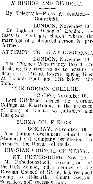 A BISHOP AND DIVORCE. By Telegraph—Press AssociationCopyright. LONDON, November 10. Dr Ingham, Bishop of London, refuses to visit any church where the marriage of a divorced person is performed. ATTEMPT TO BEAT GISBORNE. LONDON, November 10. The Thames Conservancy Board arc dredging the river so as to ensure a depth of lift at lowest spring tides at London Pool, and 10ft below the Pool. TIIE GORDON COLLEGE. CAIRO, Novemlier 10. Lord Kitchener opened the Gordon College at Khartoum, in the presence of many of the native notables and Europeans. BURMA OIL FIELDS. BOMBAY, November 10. The Indian Government refused the Standard Oil Company permission to prospect the Burma oil fields. RUSSIAN COUNCIL OF STATE. ST. PETERSBURG, Nov. 10. M. Pohodonostneff, Procurator ot the Holy Synod, and a member of the Russian Council of State, has resigned owing to ill-health. Count Sergius Seherdostinofl succeeds him.