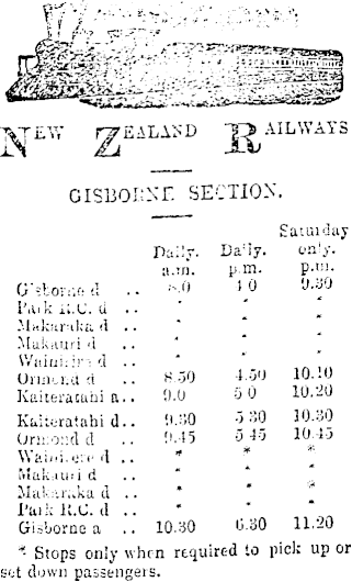 FgEALAND AIL WAYS GISBOENE SECTION. GNtoViif; d l’Aik ii.U. U •• Makankr*. *1 . ■ Mukauri <i Witiui: : d .. Unn.. lid :i Kaiteratahi a.. Kaiteratahi <].. Ormond d Waii.;..in' d.. Mukauiid .. Makarakad .. I’aikli.C. d .. Gisborne a .. £ atui day ‘ Stops only when required to pick up or sot down passengers.