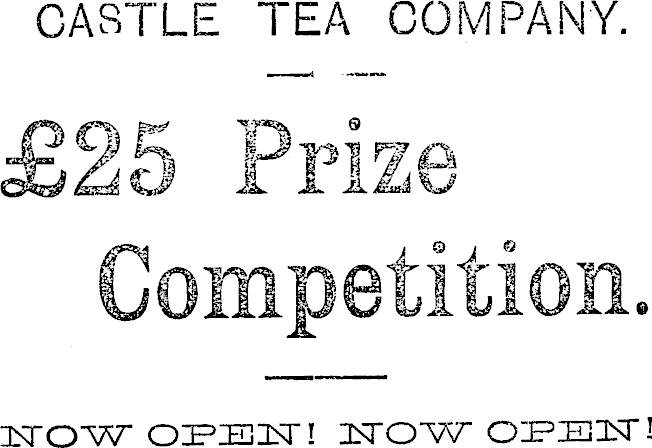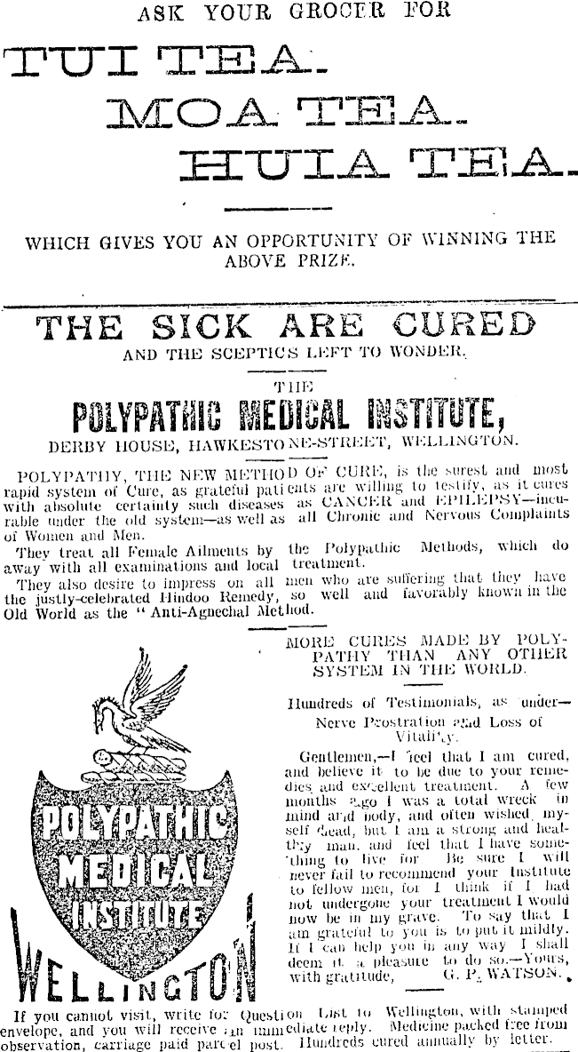 ASK YOUR GROCER EOR TTJI TEA. ZMIO.A. TIE-A.. HITJI-A. TEA. WHICH GIVES YOU AN OPPORTUNITY OF WINNING THE ABOVE PRIZE. THE SICK ARE CURED AND THE SCEPTICS LEFT TO WONDER, TIIE POLYPATiO IEDIiiAL IMSTITUTE, DERBY HOUSE, HAWKESTO NE-STKKET, WELLING i ON. POLY PATH Y, THE NEW METHOD OF CURE, is the surest ami most rapid system of Cure, as grateful patients are willuig to with absolute certainly such diseases as CANCER and El H.LI S\ me ralde under the old system—as well as all Chrome and Net unis Complaints of Women and Men. They treat all Female Ailments by the Polypatliic Methods, which do away with all examinations and local treatment, They also desire to impress on all men who are suffering that they have the justly-celebrated Hindoo Remedy, so well and lavorably known 111 the Old World as the “ Anti-Agnechal Method. MORE CURES MADE BY POLYPATIIY THAN ANY OTHER SYSTEM IN THE WORLD Hundreds of Testimonials, as under— Nerve Prostration r.'ad Loss ol V i Lilli Vy. Gentlemen,—l ieel that 1 am cured, and believe it- to he due to your remedies and excellent treatment. A few months n_go 1 was a total wreck in mind arid holly, and often wished, myself 'head, hut 1 am a strong and lieal-th.-y man. and feel that 1 have something to live for Be sure 1 will never fail to recommend your Institute to fellow men, for 1 think if 1 had nut undergone your treatment 1 would now lie in my grave. To say that 1 am grateful to you is to put it mildly. If l can help you in any way I shall deem it a pleasure to do so.— ’loms, with gratitude, U. P, \\Al SUN. . If you cannot visit, write for question List to Wellington, with stamped nvelope, and you will receive ,m immediate reply. Medicine packed tree irom bservation, carriage paid parcel post. Hundreds cured annually by letter. •S 8 GfO Eu < m I N