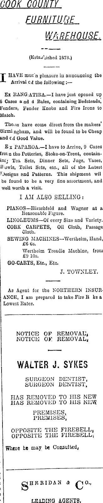 COOK COUNTY FURNITURE WAREHOUSE. (Estaj'nehed 1873.) T HAVE muc'a pleasure in announcing the Arrival c,f the following ; Ex EANG.ATIRA.—I have juat opened up 6 Cases a ad 4 Bales, containing Bedsteads, Fenders, Fender Knobs and Fire Irons to Match. Thetse have come direct from the makers Birmingham, and will be found to be Cheap and cd Good Value. E x PAPAROA.—I have to Arrive, 9 Cases frma the Potteries, Stoke-on-Trent, containing Tea Sets, Dinner Sets, Jugs, Vases, B owls, Toilet Sets, etc., all of the Latest JJeeigns and Patterns. This shipment wil be found to be a very fine assortment, and well worth a visit. I AM ALSO SELLING: PlANOS—Hirschfeld and Wagner at a Reasonable Figure. LINOLEUMS —Of every Size and Variety. CORK CARPETS, Oil Cloth, Passage Cloth. SEWING MACHlNES—Wertheim, Hand, £6 tis. Wertheim Treadle Machine, from £9 10s. GO-CARTS, Etc., Etc. J. TOWNLEY. As Agent for the NORTHERN INSURANCE, I am prepared to take Fire R ks a Lowest Rates. NOTICE OF NOTICE OF REMOVAL, WALTER J. SYKES SURGEON DENTIST, SURGEON DENTIST, HAS REMOVED TO HIS NEW HAS REMOVED TO lilS NEW PREMISES, PREMISES, OPPOSITE THE FIREBELL, OPPOSITE THE FIREBELL; Where he may be Consulted, QHEBI2AN & o°'' LEADING AGENTS.