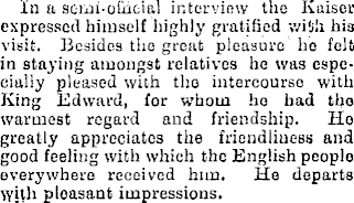 in a semi-official interview the Kaiser expressed himself highly gratified with his visit. Besides the great pleasure ho felt in staying amongst relatives he was especially pleased with tho intercourse with King Edward, for whom ho had the warmest regard and friendship. Ho greatly appreciates the friendliness and good feeling with which the English peoplo everywhere received him. Ho departs with ptoasant impressions.
