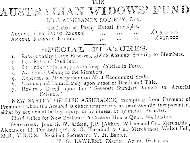 THE AITSTK.A MAN ’ v t IBOWS’ FUND LIFE ASSURANCE SOCIETY', I. ri>. Uondticted ou PureW Mutual Principle. Acccmi’i ATK!> V Kxozenj ••• / i,500,000 Annual RtvicNUK Exceeds a 237,000 SPECIAL IT I ATUKES. i. Exce»tio«a!iv Large Preserves, giv ng Absolute Security to Mem acts. ; 1,0., Rat of I’len'-iu.-n, Sstr; under Values applied to keep Policies iu Force. 4. Aii i'rofi.s belong to the Members. 5. Expenses oi Mn age "lent on Meet Economic?.! Scale. (]. Claims paid Immediately upon i'roof of Death and Title. 7. Reserves Bs>sed upon the “Severest Standard kp.o *c to Acturial Science.” NEW SYSTEM OF LIFE ASSURANCE, exempting from Payment of Premiums whet: the Assured is either temporarily or permanently incapacitated, either by accidental bodily injury, or by illness, or by mental disorder. Head Office for New Zealand: 6 Custom House Quay, Wellington. Directors: John G. VV. Aitkan, j.P. [Adlter;, Wilson and Co., Merchants], Alexander 11. Turnbull [W. A G. Turnbull A Co.. Merchants], Waltei Fell, AI.D., M.R.C.S. Resident Secretary : V. H. Baxter. T. G. LAWLESS, District Agent. Gisborne.