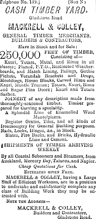 Taipboue No. UXJ [Box No CASH UMBER YARD, Gladstone Hoad aS! \k hiiLubtf GENERAL TIMBER MERCHANTS, BUILDERS & CONTRACTORS, Have in Stock and for Sale : 250,000 i'EET OF TIMBER, Consisting of— Kauri, Totaru, Mntai, and Rimu in all classes; Planed, P.T.G.,Rusticated Weatherboards, and Match Lining, l'alings, Gothic Pickets, Verandah Brackets and Drops, Mouldings, House Blocks, Carved Rimu and Kauri, Mantle Trusses; Totara, Kauri, Rimu and Sugar Pino Doors; Kauri and Totara Sashes. JOINERY of any description made from thoroughly-seasoned timber. Timber prepared for Carving a speciality. A Splendid Line of Enamelled Wood Mauteipiecc-s. Register Grates, Tiles, and all kinds of Ironmongery for General Building purposes. Nails, Locks, Hinges, Ac., in Stock. Slates, Fire Backs, and Bricks, Hydraulic Lime and Cement. a SHIPMENTS OF TIMBER ARRIVING WEEKLY By all Coastal Schooners and Steamers, from Auckland, Mercury Bay, Taiarua, and Napier. Cheap Quotations for Cash. EhTISIATES gives Fbbe. MACKRELL & COLLEY, having a Largo Stall of Efficient Workmen, are in a position to undertake and satisfactorily complete any class of Building Work they may be entrusted with. Note tub Addbess— MACKRELL & COLLEY, Builders and Contractors, Gladstone Road.