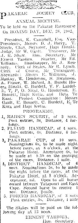 JOCKEY CTL'B. jjj AKARAI ANNUAL MEETING. To be held on the Pakarae Racecourse Oil BOXING DAY, DEC. 211, 1!HI2, President, K. Campbell, Esu. \ iccPresidenls, Messrs 1). .1. Barry, 'l. Steele, Chas. .Seymour, ilapi llmaki. Judge, Mr W. Gault. Treasurer, Mr .1. K. Shaw. lion. Secretary, Mr Ernest Tardien. ,Starter, Mr Ed. Williams. liamlicapper, Mr d. Kennedy. Clerk of Scales, Mr It. Lynch. Clerk of Course, Mr Turangauui. Stewards: Messrs Is. Williams, J. Mitckay, W. Henderson, S. Swainson, A. P laser, \V. McNeil, A. Burohi IToera ilinaki, 0. Burdett, V. P. Lardelli, T, P. O. Nicol, G. Henderson, E. Bennett,” Ilapi Kutia, and Hot a Te Kani. Protest Conmiittee : Messrs Gault, is. Bennett, C. Burdett, 10. Te Kura and Ilapi Kutia. PROGRAMME, 1. MAIDEN SCURRY, of 3 sovs. Post entries, 3s. Distance, 1 furlongs. 2. FLYING HANDICAP, of 4 sovs. Post entries, 4s. Distance, (i furlongs. 3., PAKARAIO CUP, of 10 sovs. Nomingtions (is, to he made night before races, at 3 o’clock, at the Pakarae Hotel. Acceptance 4s, to he made at !P3O on the morning of the races. Distance, 1 mile. 1. DISTRICT ‘ HANDICAP, of G sovs. Nominations ss, to he made the night before the races, at the Pakarae Hotel, at S o’clock. Acceptance, nil. Open to all horses owned between Tatapomi and East Cape- Second horse to receive l sov. Distance, jf-mile. 5. FORCED HANDICAP, of 3 sovs. Post entries, 3s. Distance, 1 mile. 'l’hc Stakes will he paid oil the following day at 12 noon. ERNEST TARIMUA, Hon. Secretary.