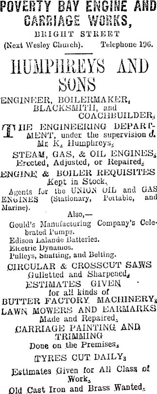 POVERTY BAY ENGINE AND CARRIAGE WORKS, 13111 G H X SXIvEET (Nest Wesley Chinch). Telephone 100. HUMPMEYS AND ISON 8 ENGINEER, BOILERMAKER* BLACKSMITH, ami COACHBUILDER,Tiie engineering depar tMENT, under the supervision a, Mr K s Humphreys;; STEAM, GAS, & OIL ENGINES* Erected, Adjusted, or Repaired.; ENGINE & BOILER REQUISITES Kept in Stock. Agents lor the UNION OIL and GAS ENoINGS (Stationary, I‘oitablo, and Marine). Also, — Gould’s Manufacturing Company's Celebrated l’umps. Edison Laluude Batteries. Electric liynamos. Pulleys, bnaiting, and Belting. .CIRCULAR & CROSSCUT SAWS .Gulletted and Sharpened*, ESTIMATES GIVEN lor all kinds of BUTTER FACTORY. MACIIINERYj LAWN MOWERS AND EARMARKS Made and Repaired. CARRIAGE PAINTING AND TRIMMING Done on the Premises* (TYRES CUT. DAILY a Estimates Given for All Class of Work. Old Cast Iron and Brass .Wanted;.