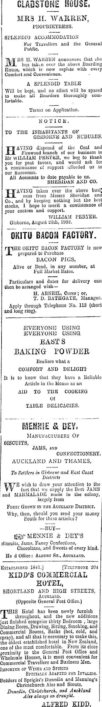 GLADSTONE HOUSE, MRS 11. WARREN, PROPRIETRESS. SPLENDID ACCOMMODATION Pur Travellers and the General Public. MliS 11. WARREN announces that she has tabui over the above Boarding House, which is now replete with every Comfort anil Convenience. A SPLENDID TABLE Will be kept, and no effort will bo spared to make all Boardors thoroughly comfortable. Terms on Application. NOTICE. TO THE INHABITANTS OP GISBOItNE AND SUBURBS. HAVING disposed of the- Coal and firewood branch of our business to Mr WILLIAM PEKYER, we beg to thank you for past favors, and would ask for a continuance of support afforded us to our Successor. All Accounts to date payable to us. SHEItIDAN AND CO. HAYING taken over the above busij ness from Messrs Sheridan and Co., and by keeping nothing but the best stocks, I hope to merit a continuance of your custom and support. WILLIAM PERYER. Gisborno, August 25th, 1902. OKITU BACOH FACTORY. mHE OKITD BACON FACTORY is now JL prepared to Purchase BACON PIGS, Alive or Dead, in any number, at Pull Market Rates. Particulars and dates lor delivery can then be arranged with— H. ARNEIL, Curcr; or, T. D. BATHGATE, Manager. Apply through Telephone No. 113 (short and long ring). EVERYONE USING EVERYONE USING EAST S RAKING POWDER Realises what a COMFORT AND DELIGHT It is to know that they havo a Reliable Articlo in the House as an AID TO THE COOKING 01 TABLE DELICACIES. mm\E & m, Manufacturers Of BISCUITS, JAMS, AND CONFECTIONERY. AUCKLAND AND THAMES, To Setllcrs in Gisborne and East Coast Districts WE wish to draw your attention to the fact that wo supply the Best JAMS and MARMALADE made in the colony, largely irom Fruit Grown in the Auckland District. Why, then, should you send your money South for thcso articles ? —BUY—ggf MENNIE & DEY’S Biscuits, Jams, Fancy Confections, Chocolates, and Sweets of every kind. He d Office: Albert St., Auckland. Established 1811.] [Telephone 204 KIDD'S COMMERCIAL HOTEL, SHORTLAND AND HIGH STREETS, Auckland. (Opposite General Post Office.) THIS Hotel has been newly furnish throughout, and the new additions just finished comprise thirty Bedroom , large Dining Room, Drawing, Sitting, Smoking, and Commercial Rooms, Baths (hot, cold, and spray), and all that is necessary to make this, the oldest established hotel in New Zealand, one of the most comfortable. From its close ! proximity to the General Post Office and ; Wholesale Houses, it is most convenient for 1 Commercial Travellers ami Business Men. ; Importer of Wines and Spirits Specially Adapted for Invalids. Bottlers oi Speight’s Dunedin and Manning’s j Christchurch Ales aud Stouts. Dunedin, Christchurch, and Auckland , Ales always on draught. ALFBED KIDD.