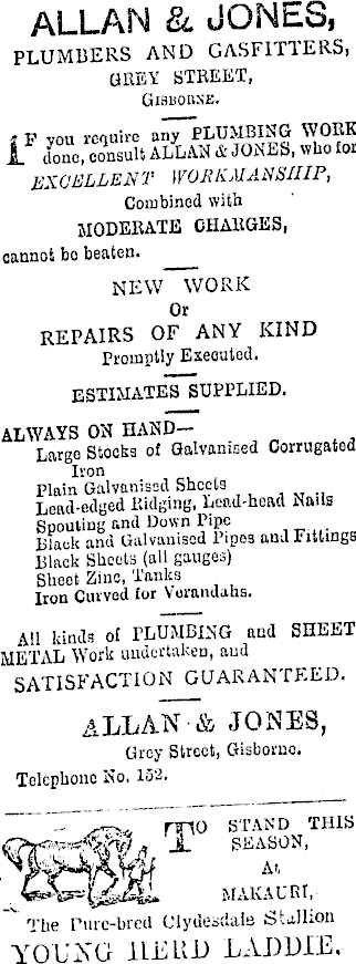 ALLAN & JONES, PLUMBERS AND GASFITTERS, OBEY STREET, GISIiOUNE. i F vou require any PLUMBING WORK I r done, consult ALLAN & JONES, who for EXCELLENT WORKMANSHIP, Combined with MODERATE CHARGES, cannot bo beaten. NEW WORK Or REPAIRS OF ANY KIND Promptly Executed. ESTIMATES SUPPLIED. ALWAYS on hand— Largo Stocks of Galvanised Corrugated Iron Plain Galvanised Sheets Lead-edged Ridging, Load-head Nails SDOUting and Down Pipe Black and Galvanised Pipes and Fittings Black Sheets (all gauges) Sheot Zinc, Tanks Iron Curved for V erandahs. All kinds of PLUMBING and SHEET METAL Work undertaken, and SATISFACTION GUARANTEED. ALLAN & JONES, Grey Street, Gisborne. Telephone No, 152. mo The Pure-bred CTyue STAND THIS SEASON, At MAKAURT, adale Stallion YOUNG 11ELM) LADDIE.