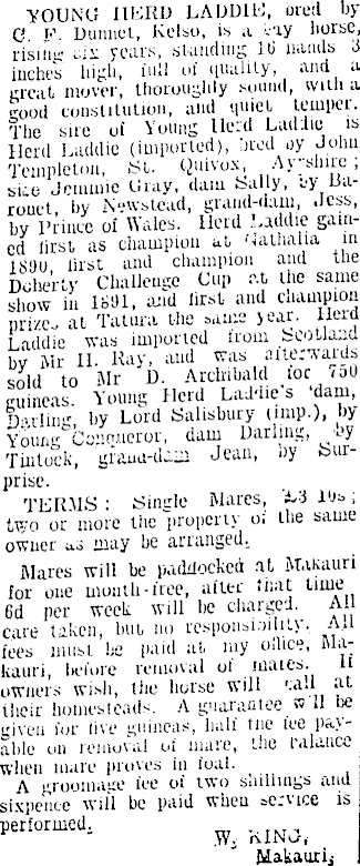 YOUNG lIURD LADDIE, ored by 0. F. Dunnet, Kelso, is a buy horse, rising: mi: years, .standing 10 hands !i inches high, mil of quality, and a great mover, thoroughly sound, with a good constitution, and iiuiet temper. The sue of Voting Held Laddie is Herd Laddie (imported), nod oy John Templeton, St. tjuivox, Ayrshire ; sice Jciniiiie Gray, dam bally, py 13arouet, by News tend, grand-darn, .less, by Prince of Wales. Herd Laddie gained lirst as champion at 'mthalia in ISOU lirst and champion and the Dolie’rtv Challenge Cup at the same show iii loDl, and lirst and champion prize, at Tatura the same year. Herd Laddie was imported from bv Mr II Ray, and was afterwards Sid to Mr D. Archibald toe 750 guineas. Young Herd Laddie s ‘dam Darling, by Lord Salisbury (imp.), by Younc Conqueror, clam Darling, -jy Tintock, grand-iiam Jean, ny borprise. TERMS : Single Marcs, LI I'Js, two or more the property o; the same owner as may be arranged. Mares will be paddockea at MaKauri for one month-free, niter that time Gd per week will he charged. All care taken, but no responstoiluy. -V 1 i fees must be paid at my odice, Makauri, before removal oi mates. it owners wish, the horse will tall at • their homesteads. A guarantee wll be | given for live guineas, half tne fee pay- j able on removal oi mare, the balance j when male proves in foal. ..roomage fee oi two shillings and j sixpence will be paid when service is j performedi W, KING, I Makaurij 1