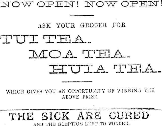 JSTOW OIPIEHST! ITOW OPEIT! ASK YOUR GROCER J'OR TOT TEA. HITTI-A. TIEiYL. WHICH GIVES YOU AN OPPORTUNITY OF WINNING THE ABOVE PRIZE. THE SICK ARE CURED AND THE SCEPTICS LEFT TO WONDER.