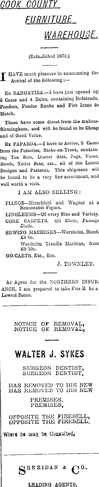 COOK QQMBL FMMMJL wamujml (Estajliehcd 1873.) I HAVE much pleasure iu announcing the Arrival of the following ; Ex 11 ANGATIIIA. —I have just opened up 6 Caseß and 4 Sales, containing Bedsteads, Fenders, Fender Knobs and Fire Irons to Match. These have come direct from the makers' Birmingham, and will bo found to be Cheap and of Good Value. Ex PAPAROA.—I have to Arrive, 9 Cases from the Potteries, Stoke-on-Trent, containing Tea Sets, Dinner Sets, Jugs, Vases, Bowls, Toilet Sets, etc., all of the Latest Designs and Patterns. This shipment wil be found to be a very fine assortment, and well worth a visit. I Ail ALSO SELLING : PlANOS—Eirschfeid and Wagner at a Reasonable Figure. LINOLEUMS—Of every Size and Variety. CORK CARPETS, Oil Cloth, PassageCloth. SEWING MACHlNES—Wertheim, Hand, £G Gs. Wertheim Treadle Machine, from £9 10s. GO-CARTS, Etc., Etc. J. TOWNLEY. As Agent for the NORTHERN INSURANCE, I am prepared to take Fire R ks a Lowest Kates. NOTICE OF REMOVAL* NOTICE OE REMOVAL, WALTER J. SYKES SURGEON DENTIST, SURGEON DENTIST, HAS REMOVED TO HIS NEW HAS REMOVED TO HIS NEW PREMISES, PREMISES, OPPOSITE THE FIREBELL, OPPOSITE THE FIREBELLi Where he may. bo Consulted, IHR BID AN & c 0., LEADING AGENTS.