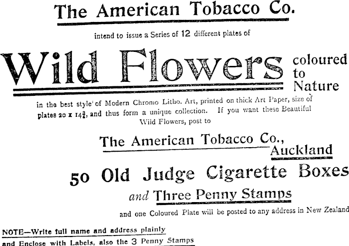The American Tobacco Co. intend to issue a Series of 12 different plates of Wild F in the best style’ of Modern Chrome Litho. Art, printed on thick Art Paper, size of plates ao z 141, and thus form a unique collection. If you want these Beauti u Wild Flowers, post to The American Tobacco Co., — Auckland 50 Old Judge Cigarette Boxes and Three Penny Stamps and one Coloured Plate will be posted to any address in New Zealand NOTE— Write tull name and address plainly and Enclose with Labels, also the 3 Penny Stamps owers coloured to Nature